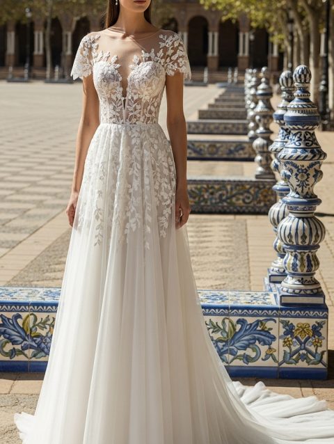 Elegant Lace A-Line Wedding Dress with Long Train